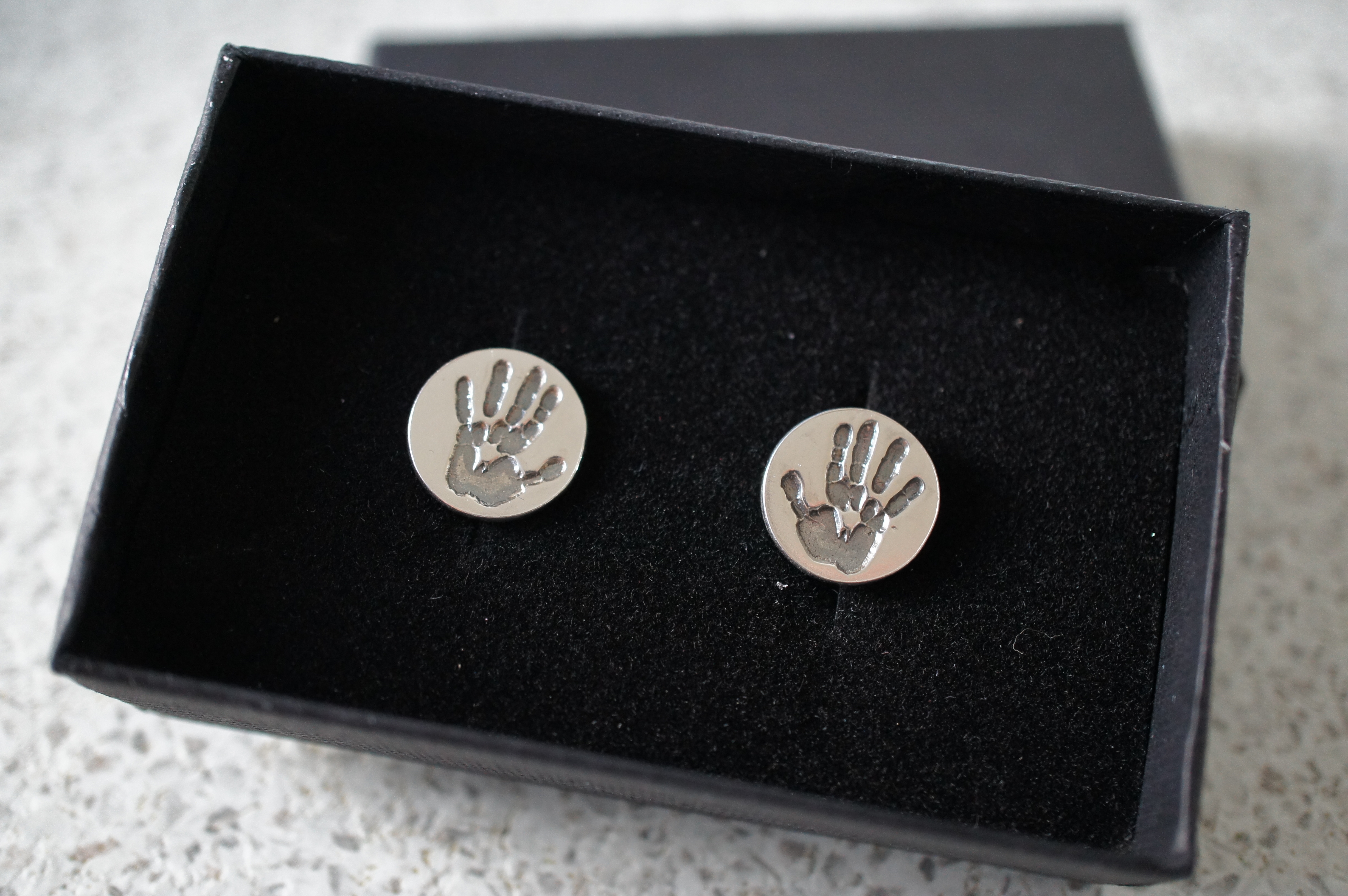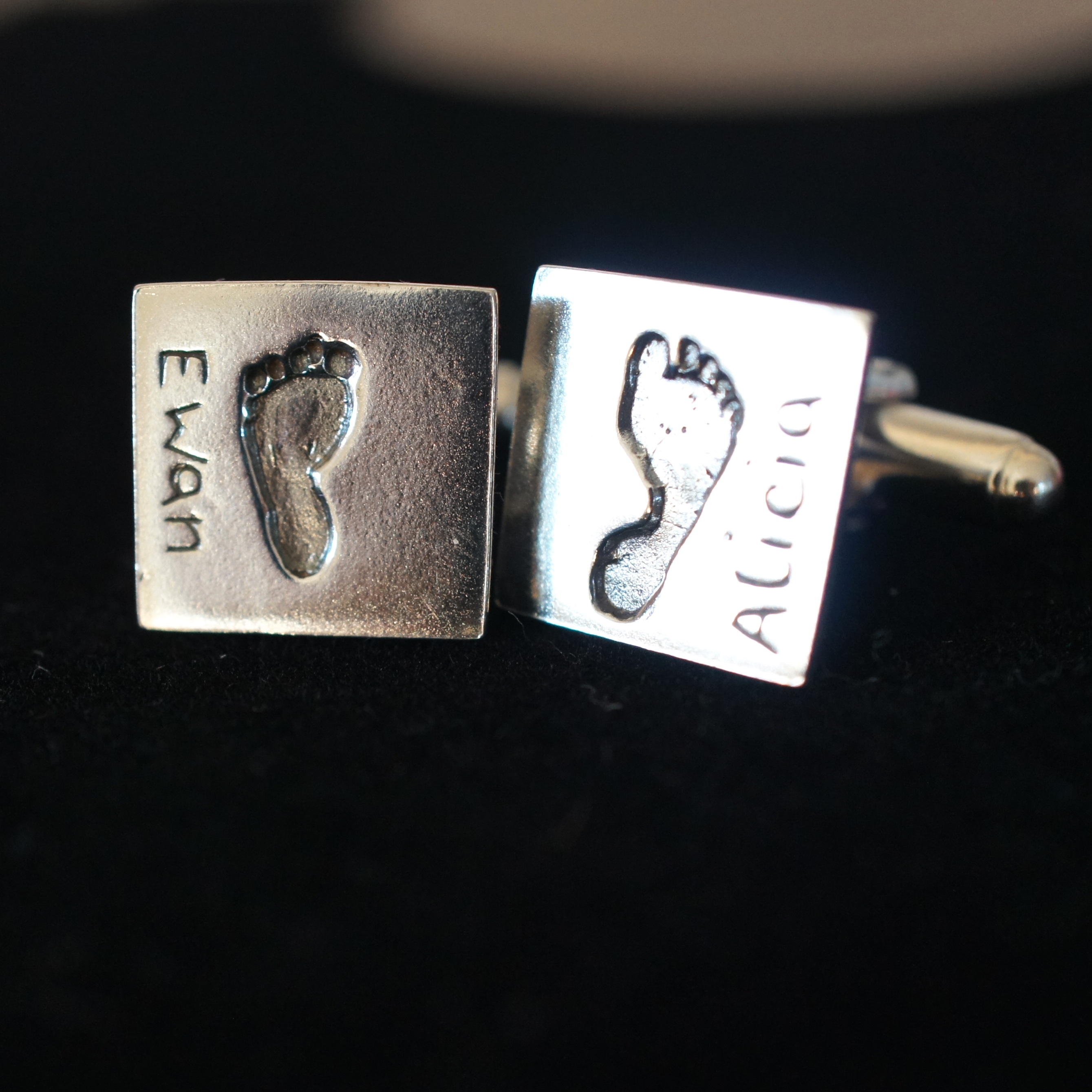 Fine silver cufflinks showcasing the tiny prints of a new baby, children or a treasured pet.