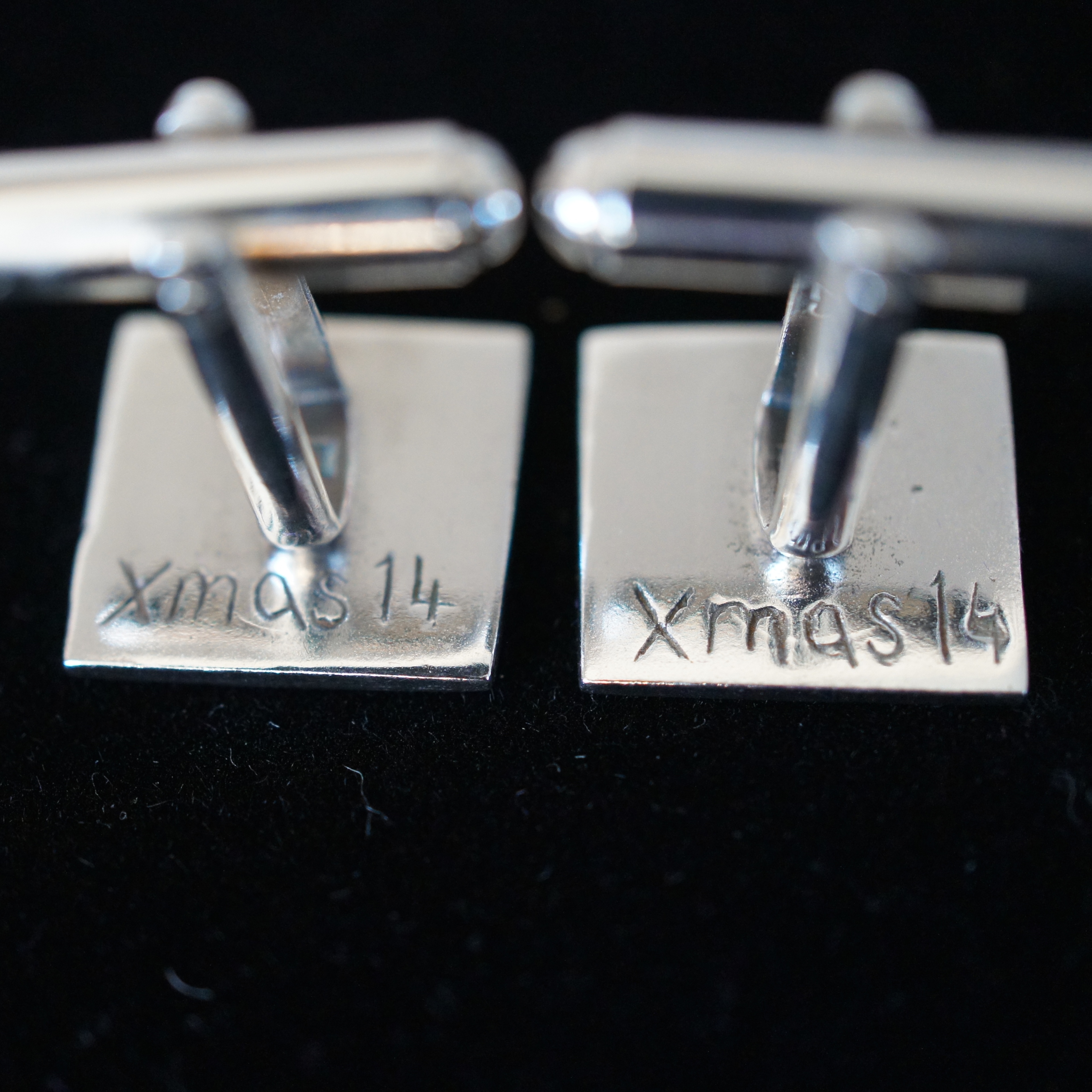 A hand scribed initial/name or date can be added to your cufflinks at no extra cost. If you would like professional engraving then email me to enquire on costs as prices vary.